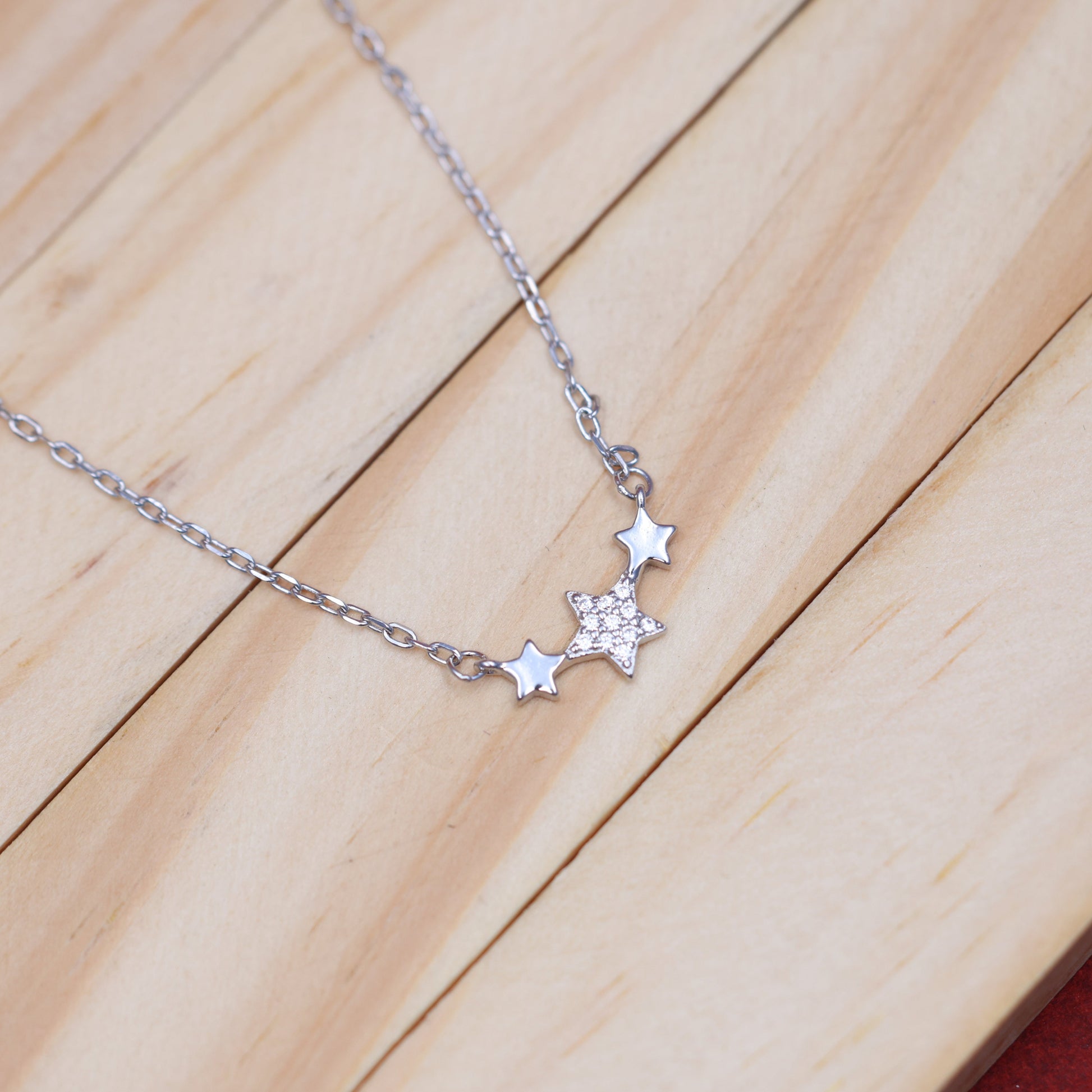 Shine bright with this elegant 92.5 Sterling Silver Chain Necklace, beautifully crafted with a trio of star motifs. The center star sparkles with Moissanite Diamond / Lab grown diamond, offering brilliance close to natural diamonds at a fraction of the price .