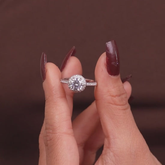 Experience timeless beauty with this stunning 925 Sterling Silver Halo Engagement Ring. A radiant round-cut Moissanite diamond shines at the center, surrounded by a sparkling halo of smaller stones. The design delivers dazzling brilliance from every angle. Every ring is made to showcase exceptional quality and fire, making it a perfect symbol of lifelong love.