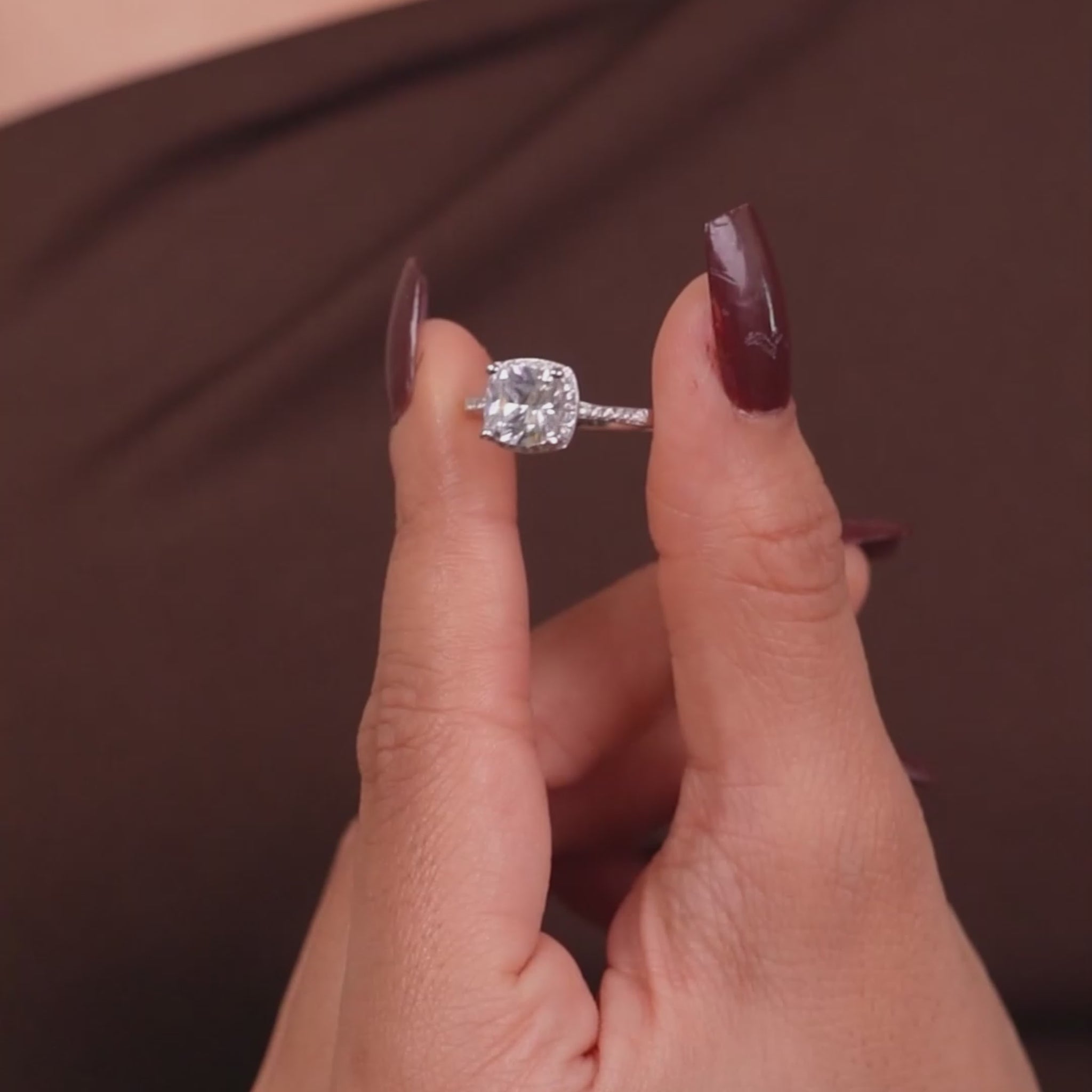 The dazzling cushion-cut center Moissanite is surrounded by a shimmering halo of smaller Moissanite diamonds, enhancing brilliance and size appearance.