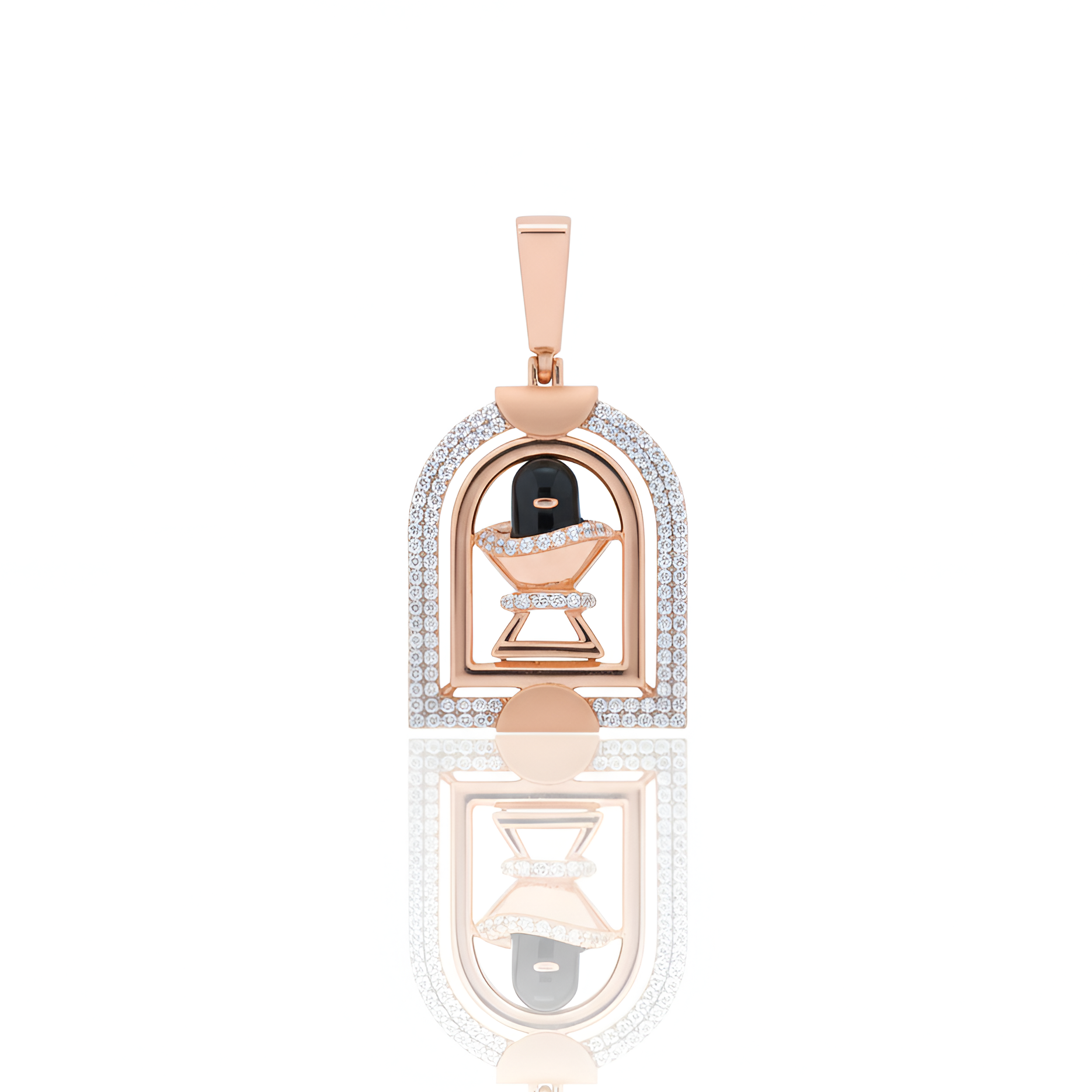 Showcase your devotion with this bold and beautifully crafted men's Shivling pendant. Featuring a striking black Shivling centerpiece set within a shimmering arch of American diamonds, this pendant blends spirituality with premium design. Crafted in a masculine silhouette, it makes a powerful style statement while honoring divine energies. pdc-12909