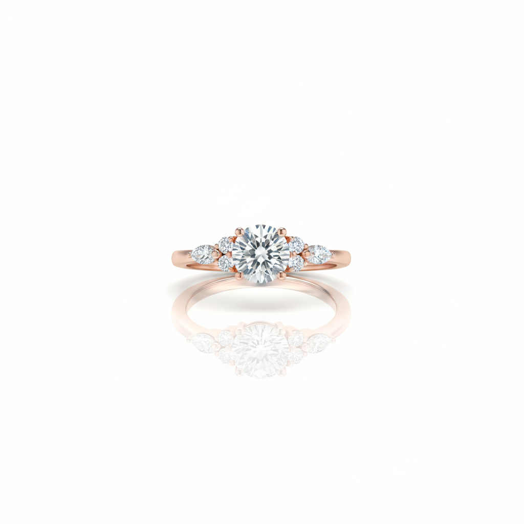 This elegant Moissanite Diamond ring features a brilliant round center stone enhanced by sparkling side accent stones, creating a romantic and luxurious look. Perfect for engagements and special occasions.