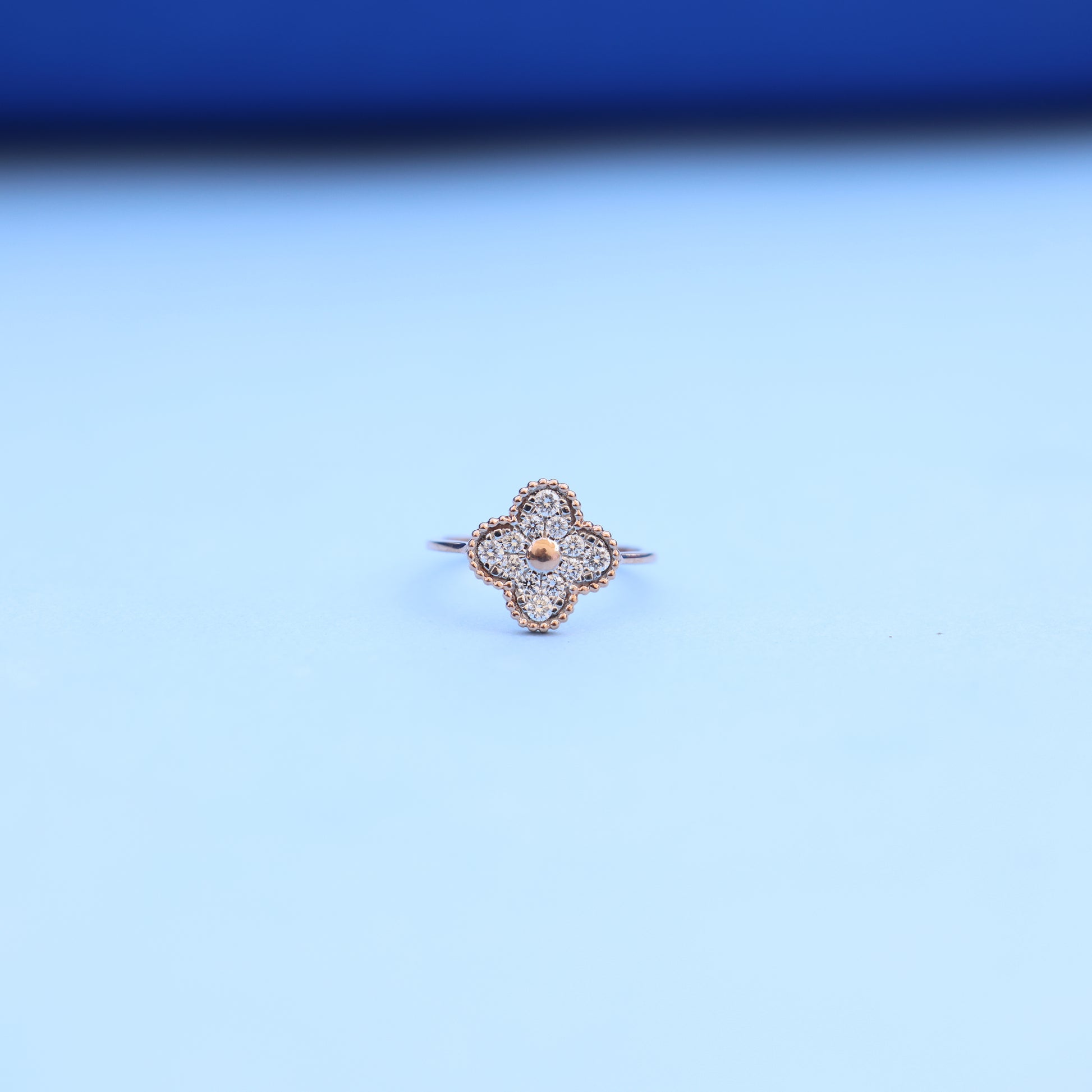 This charming rose gold ring features a beautifully crafted floral design encrusted with sparkling lab-grown diamonds. The centerpiece is shaped like a four-petal flower with a brilliant round stone in the center, surrounded by a halo of shimmering diamonds. With its feminine silhouette and ethical appeal, this piece makes a graceful statement. DLRD-2176