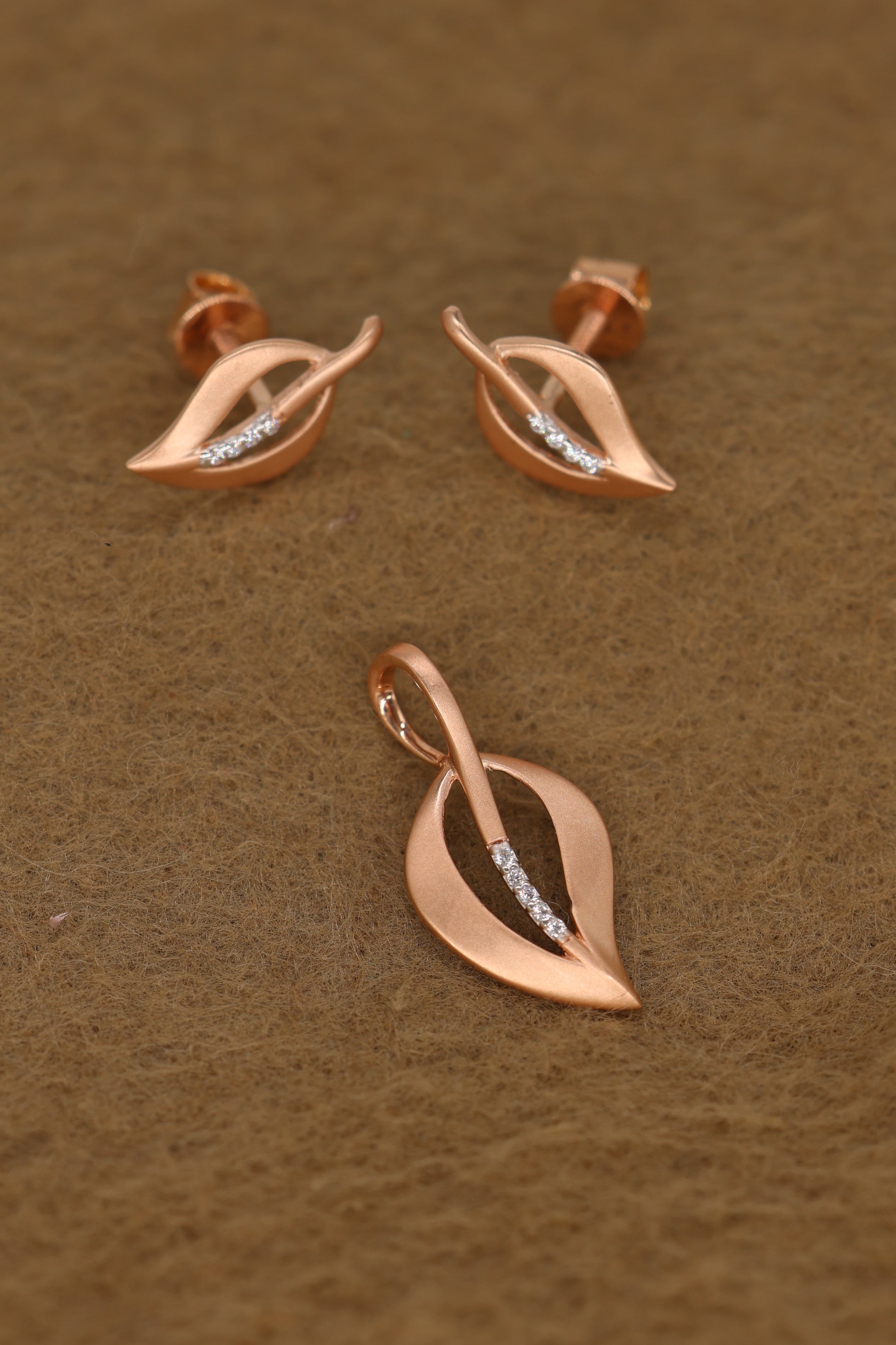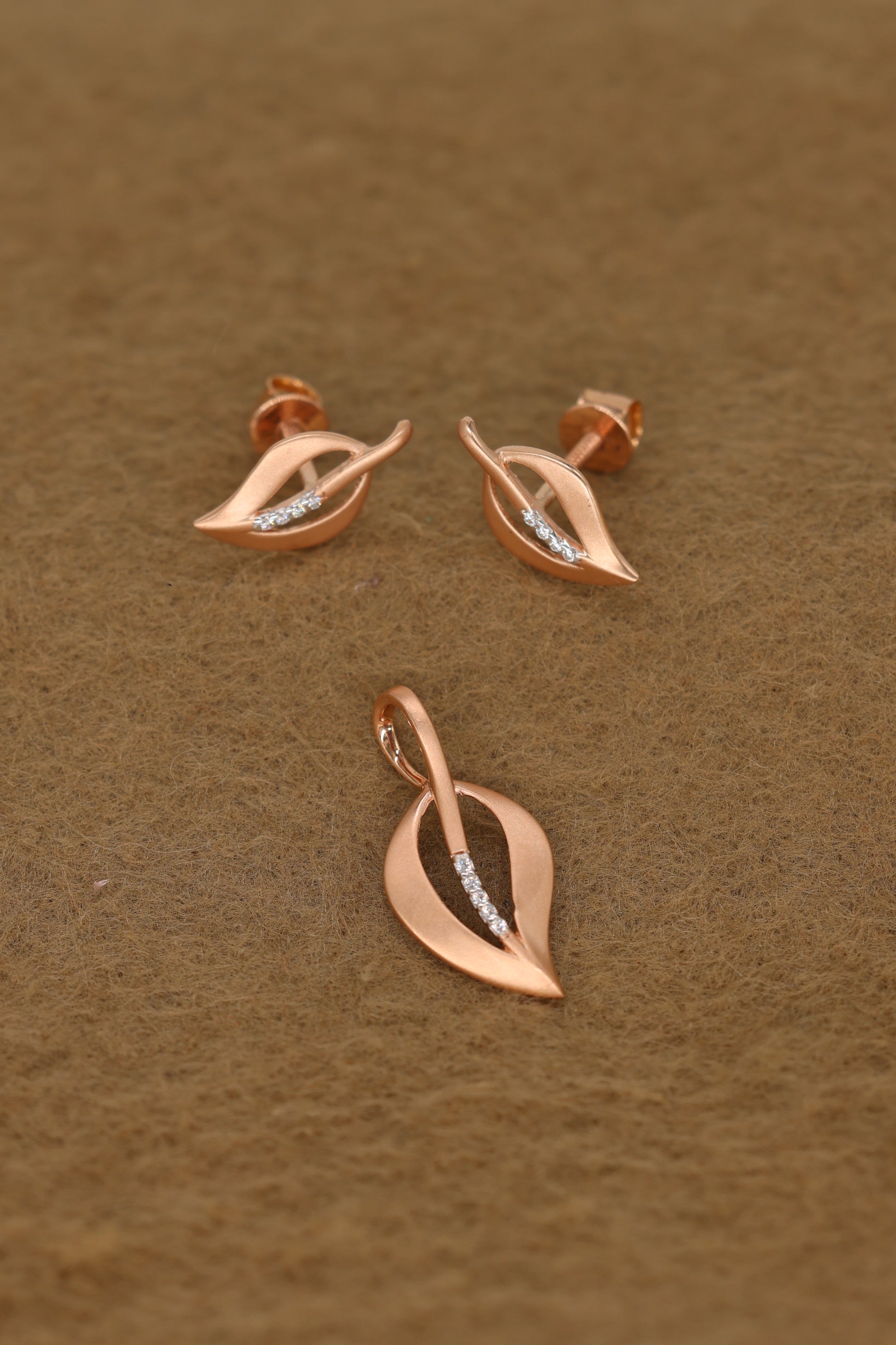 Add a touch of sophistication to your jewelry collection with this stunning rose gold jewelry set from Swaadha Jewels. Inspired by nature, the set features a graceful leaf design, complemented by sparkling American diamonds that line the center of each piece. The set includes a pair of finely crafted earrings and a matching pendant, all in luxurious rose gold.