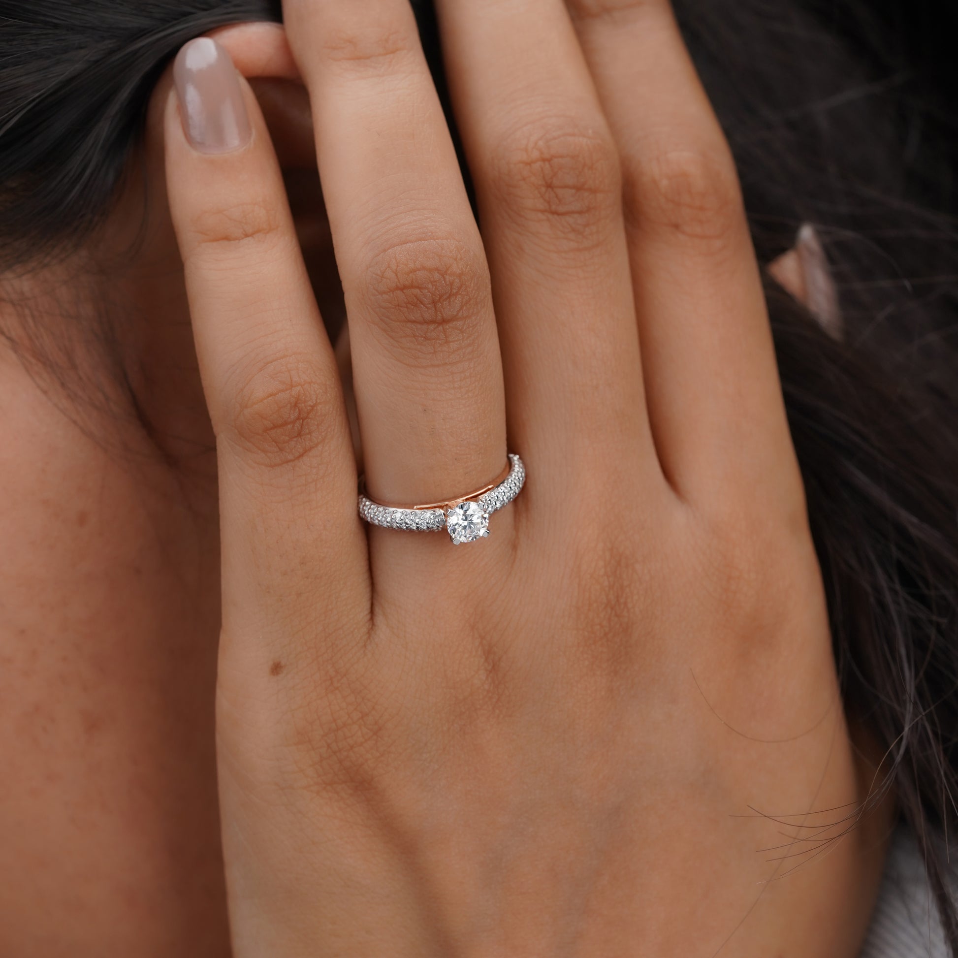Timeless and elegant, this solitaire Moissanite diamond ring features a brilliant round-cut center Moissanite secured in a classic prong setting. The slim band is adorned with micro-pavé Moissanite diamonds, adding extra sparkle while keeping the design refined and minimal.