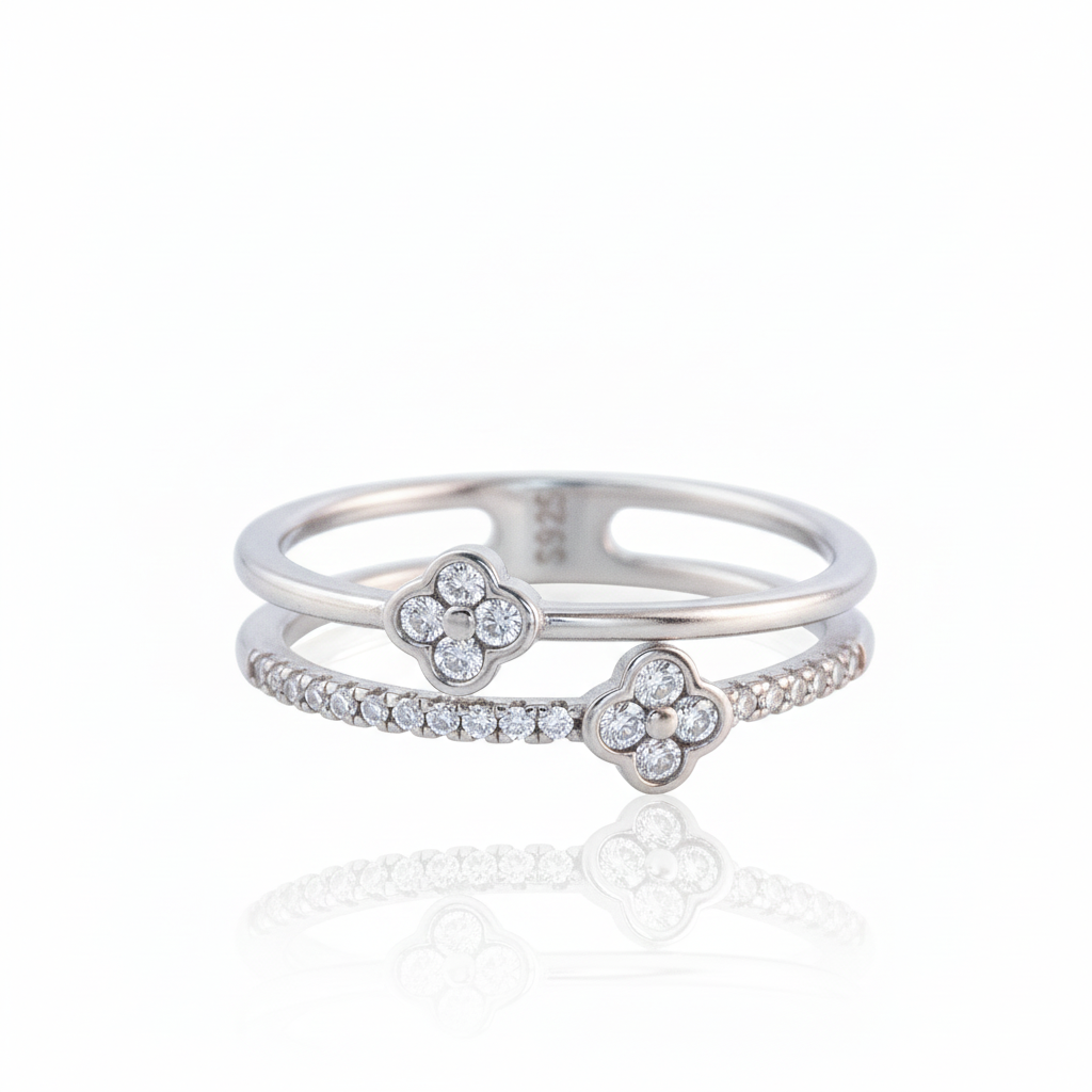 The ring features a stylish layered band design with two delicate flower-shaped motifs, each adorned with sparkling brilliant-cut Moissanite diamonds.