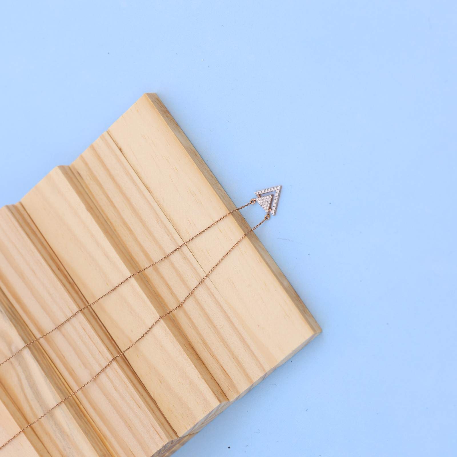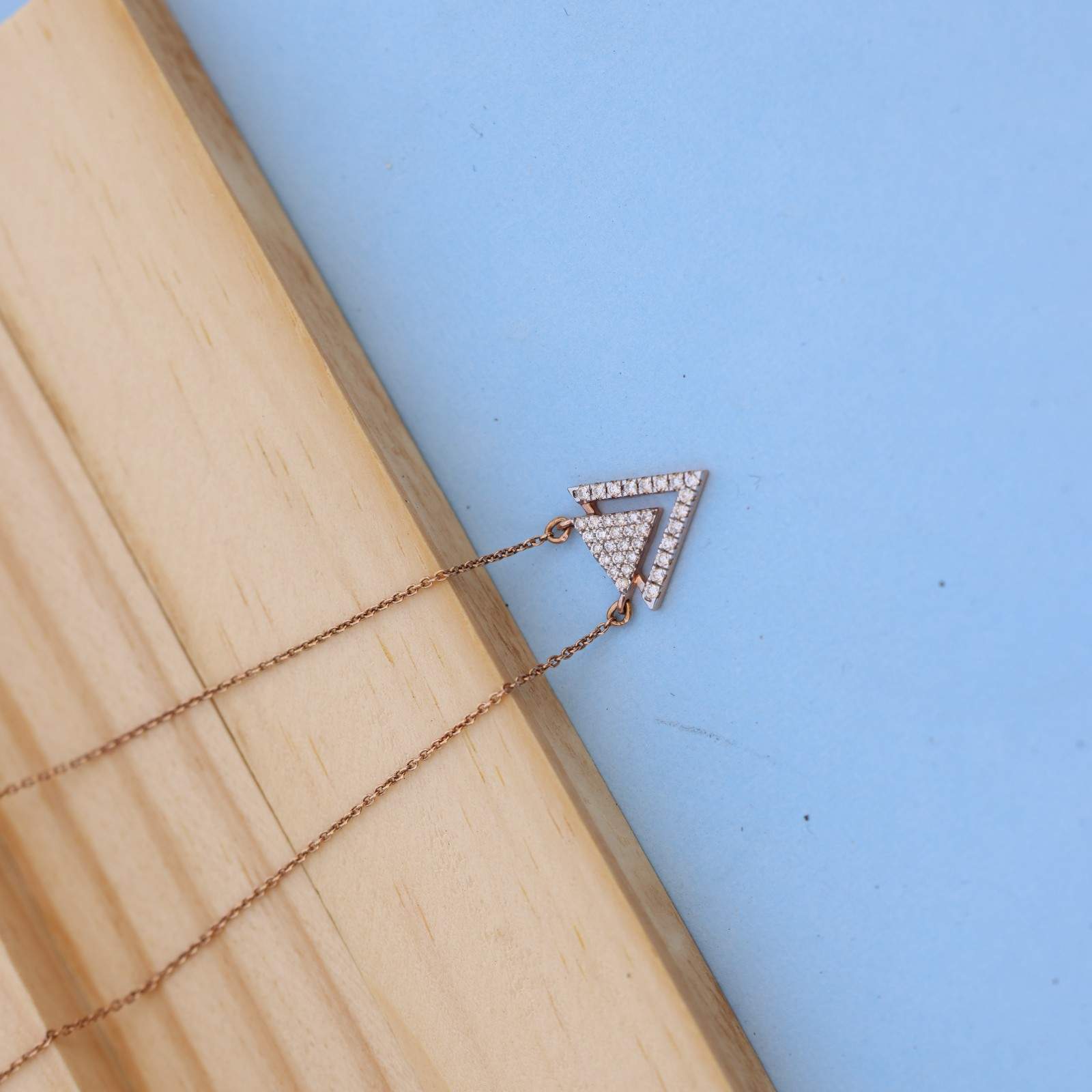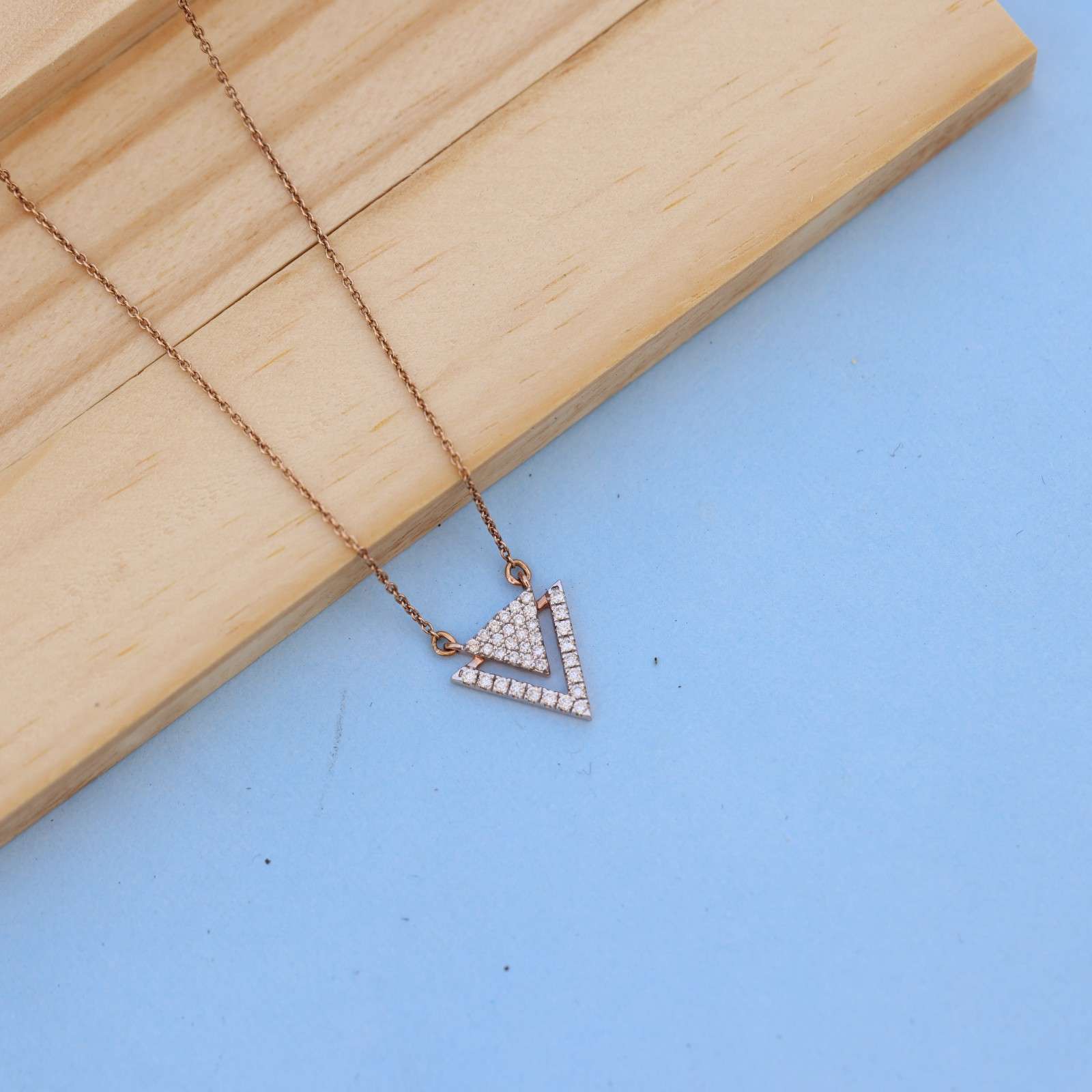 Item Description: This stunning double-layered inverted triangle pendant necklace showcases a perfect blend of modern design and timeless charm. Meticulously set with brilliant lab-grown diamonds, the piece offers eco-conscious luxury and unparalleled sparkle. The pendant's geometric elegance is enhanced by a delicate rose gold setting, adding warmth and sophistication.