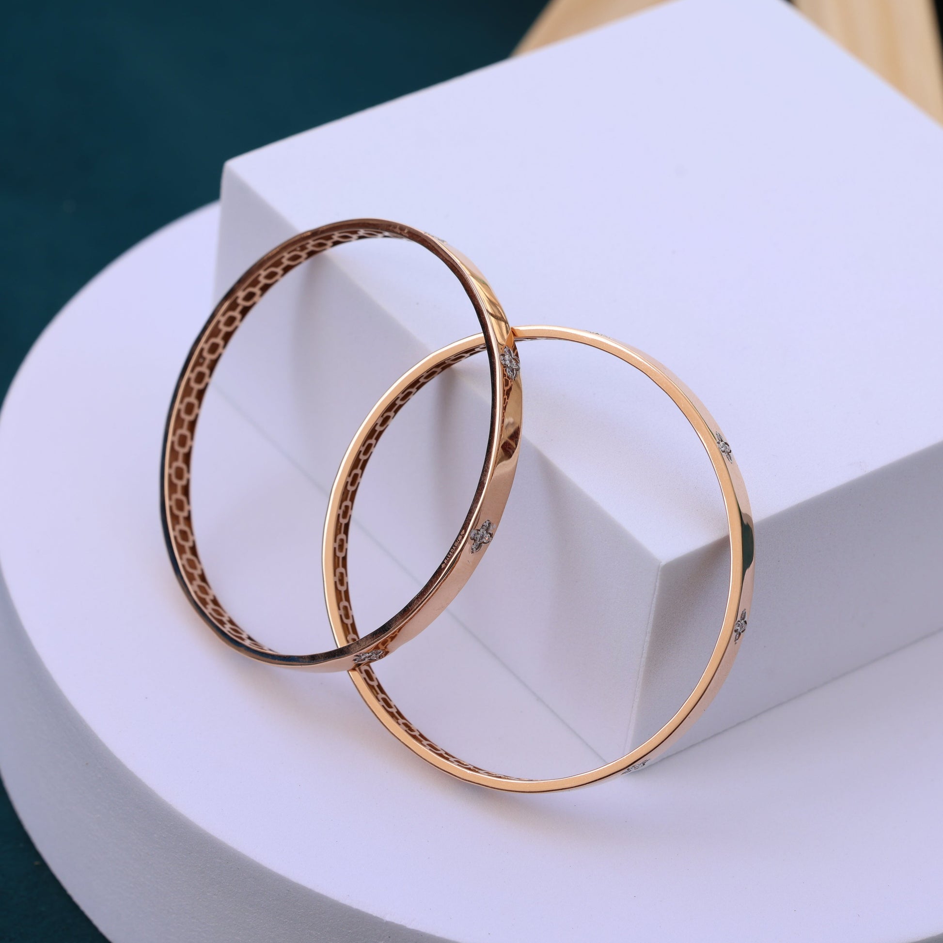 Enhance your jewelry collection with this stunning set of two rose gold plated bangle bracelets. These bangles feature a smooth, polished exterior adorned with delicate, diamond-like floral accents evenly spaced around the circumference. The interior showcases an intricate geometric pattern, adding a touch of sophistication and uniqueness to each piece.