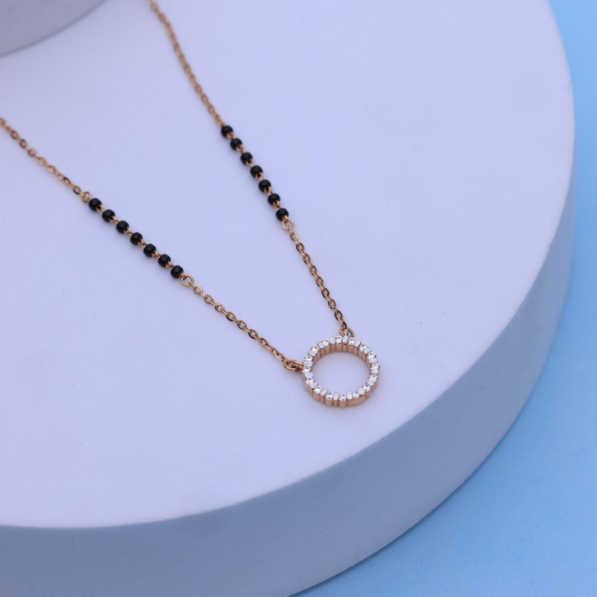 Add a modern twist to timeless tradition with this beautifully crafted lightweight mangalsutra. Featuring a delicate gold-plated chain accented with classic black beads and a sparkling American diamond-studded circular pendant, this piece blends elegance with spiritual significance. Ideal for daily wear or gifting, this design is perfect for today's stylish yet rooted woman.MSCC-734