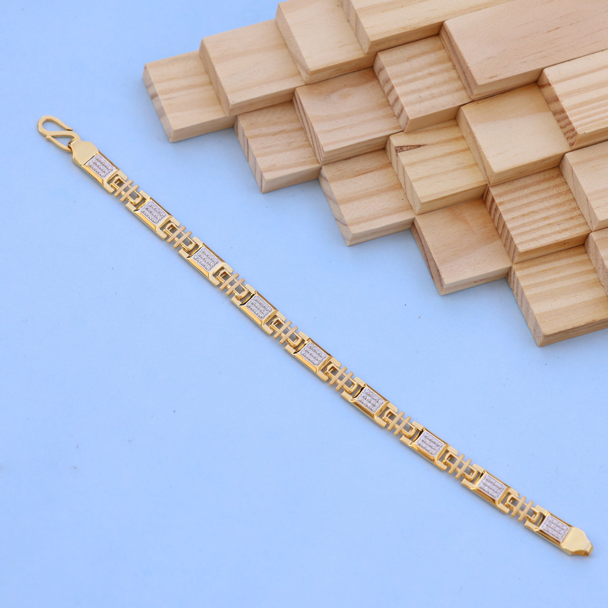 Elevate your style with this striking gold-tone bracelet, meticulously crafted for those who love a bold yet elegant look. Adorned with shimmering American diamonds set in a modern geometric design, this piece exudes sophistication and charm. GBC-3559
