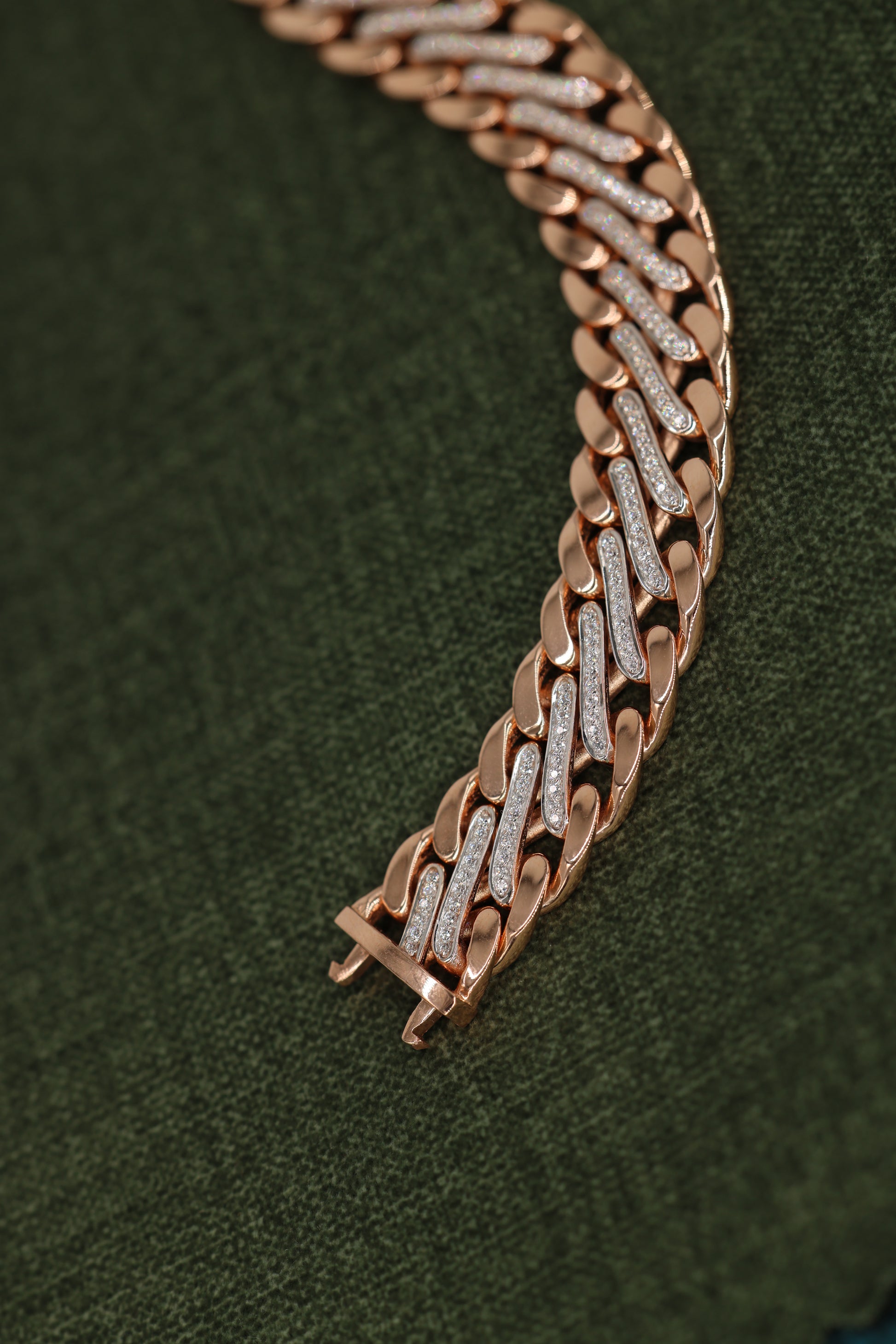The warm glow of the rose gold pairs perfectly with the sparkle of the diamonds, creating a piece that’s versatile enough for both casual and formal occasions. Whether you're searching for a memorable gift or an exquisite addition to your personal collection, this diamond-studded Cuban link bracelet is designed to impress.