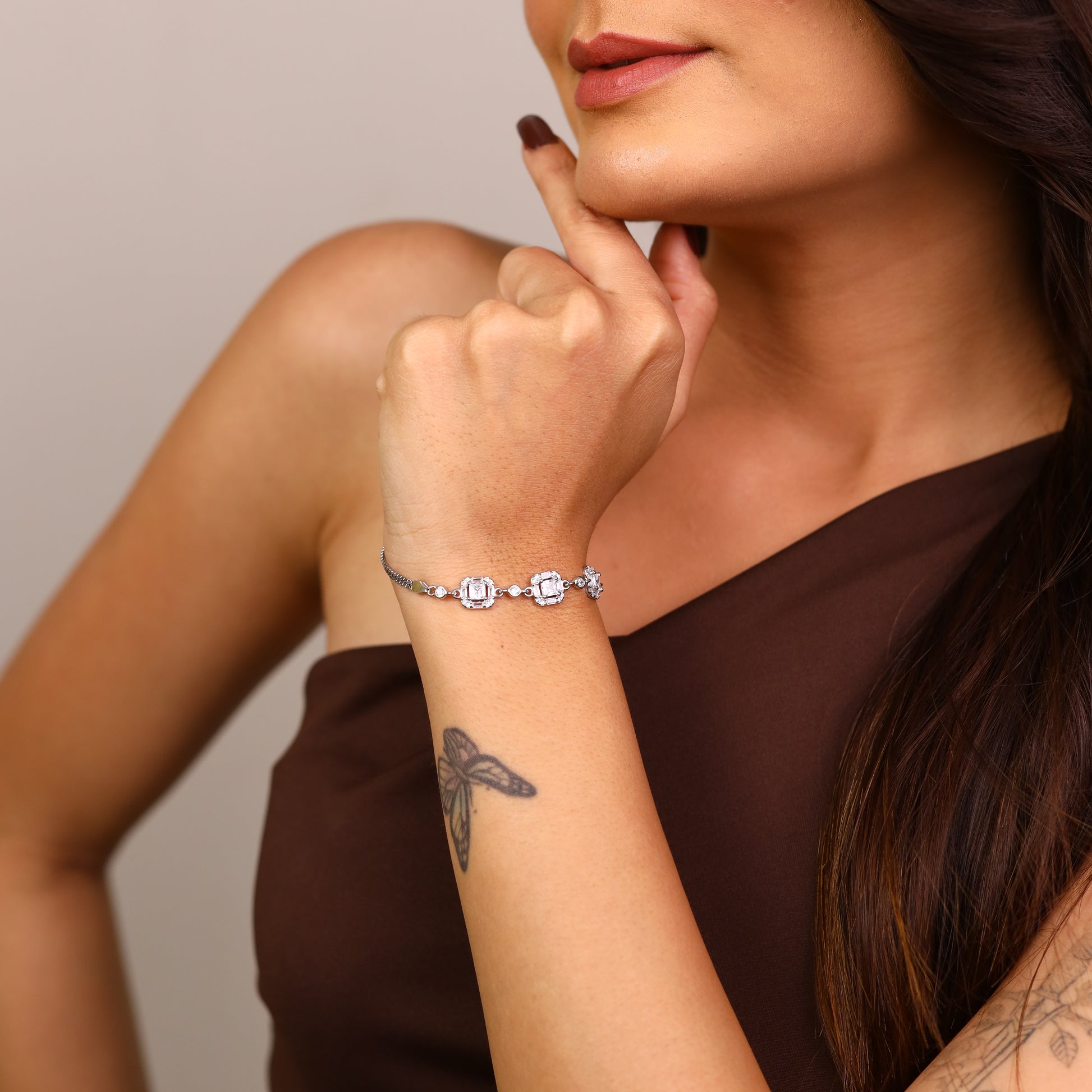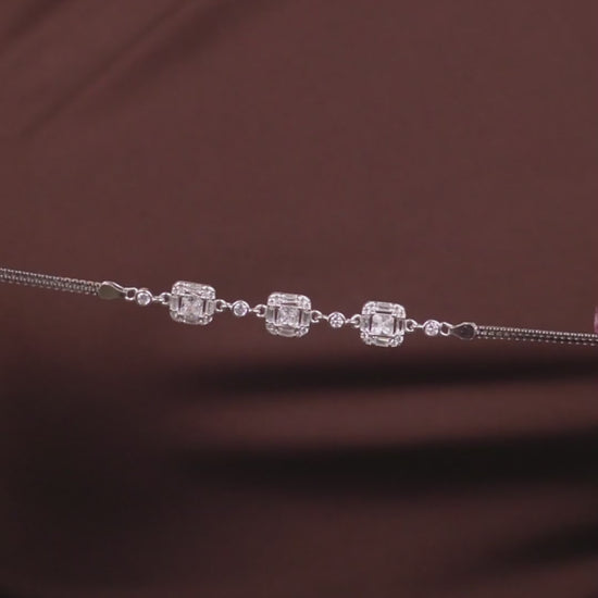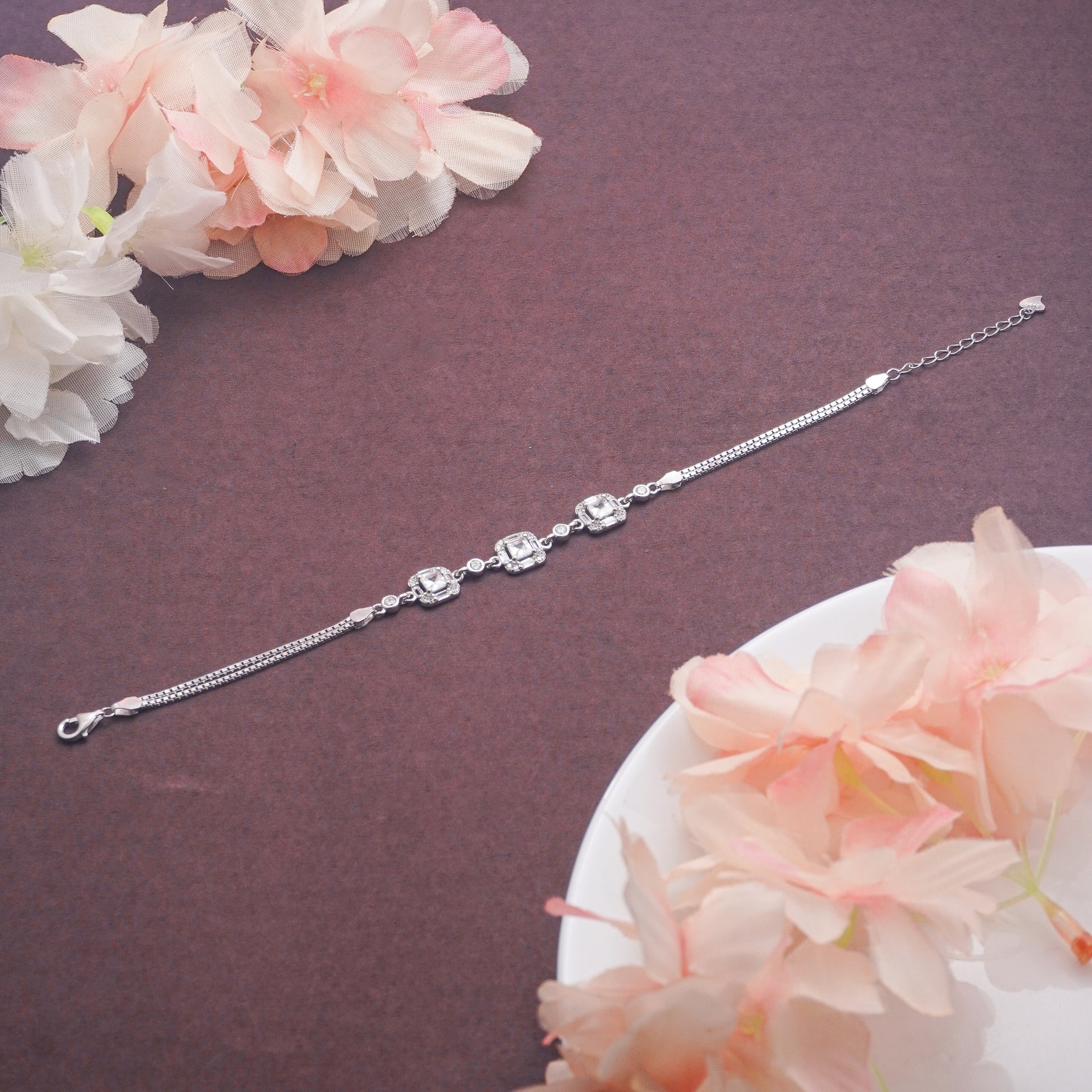 Crafted in premium 925 Sterling Silver with high-polish rhodium finish, this bracelet offers exceptional shine and durability. The elegant square halo design combined with a sleek chain makes it perfect for both everyday luxury and special occasions.
