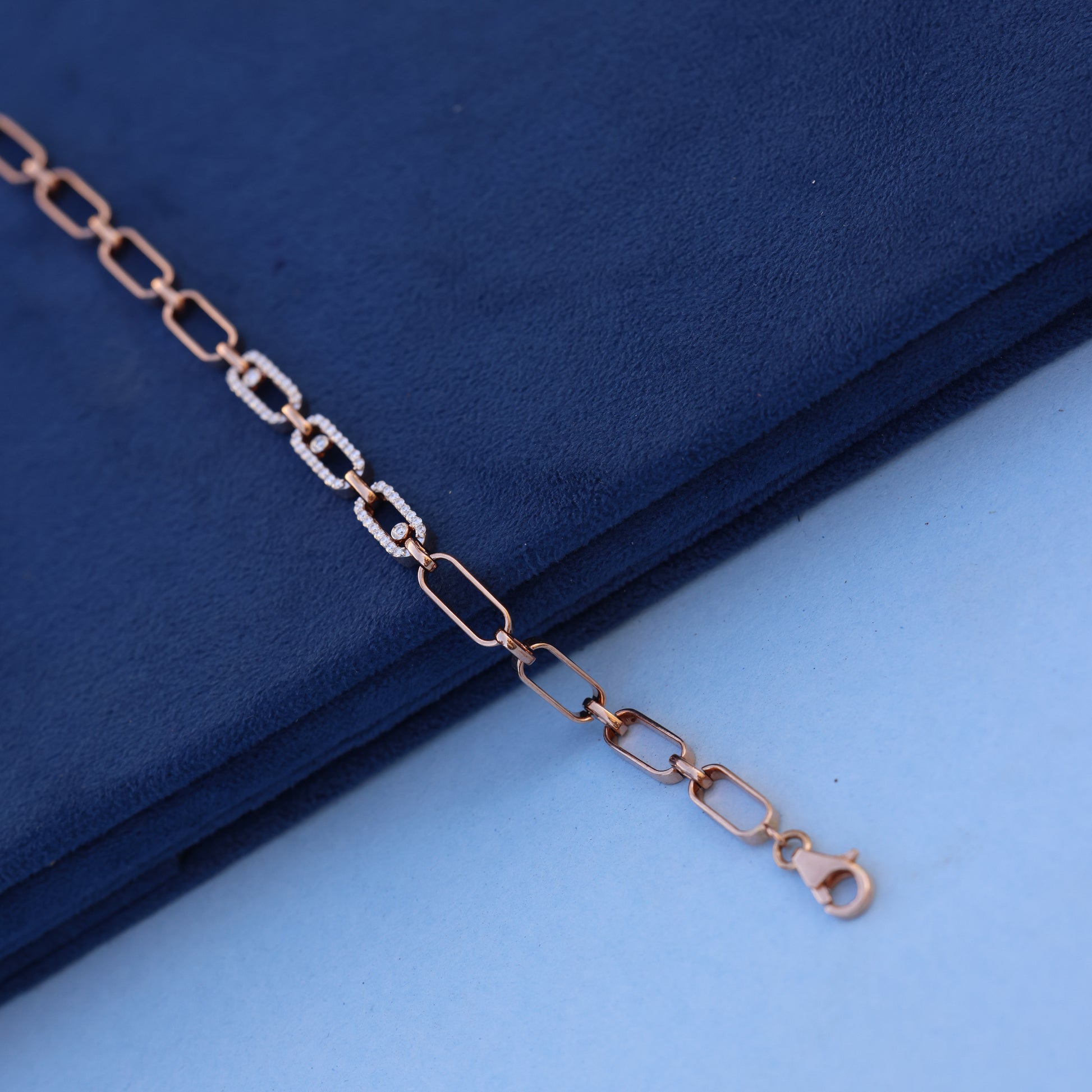 Make a bold yet refined style statement with this geometric rose gold link bracelet, masterfully adorned with dazzling lab-grown diamonds. Featuring a sleek sequence of elongated rectangular links, this piece is elevated by select diamond-studded connectors — adding a captivating sparkle that catches the light with every movement.