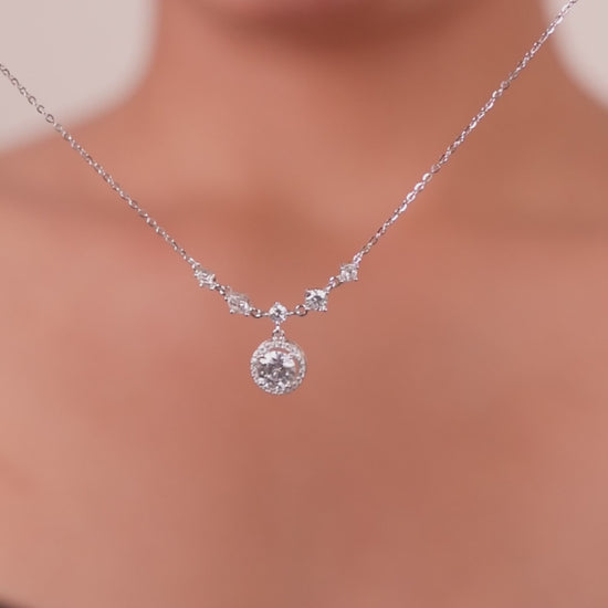 The round-cut Moissanite Diamond is surrounded by a shimmering halo of smaller Moissanite stones, creating a stunning sparkle from every angle. Delicate accent stones along the chain add a graceful touch, making this necklace perfect for both daily wear and special occasions.