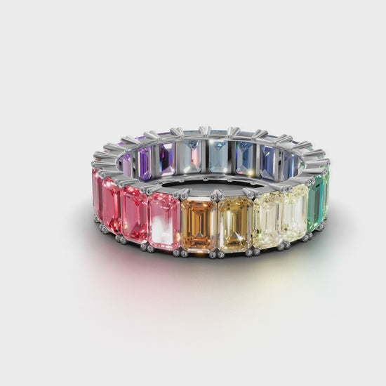 Elevate your jewelry collection with this stunning Rainbow Eternity Band Ring, beautifully crafted with emerald-cut multicolor gemstones set all around the band. Each stone is precision-cut to create maximum brilliance, arranged in a gradient rainbow pattern that gives the ring a bold, luxurious, and eye-catching look.