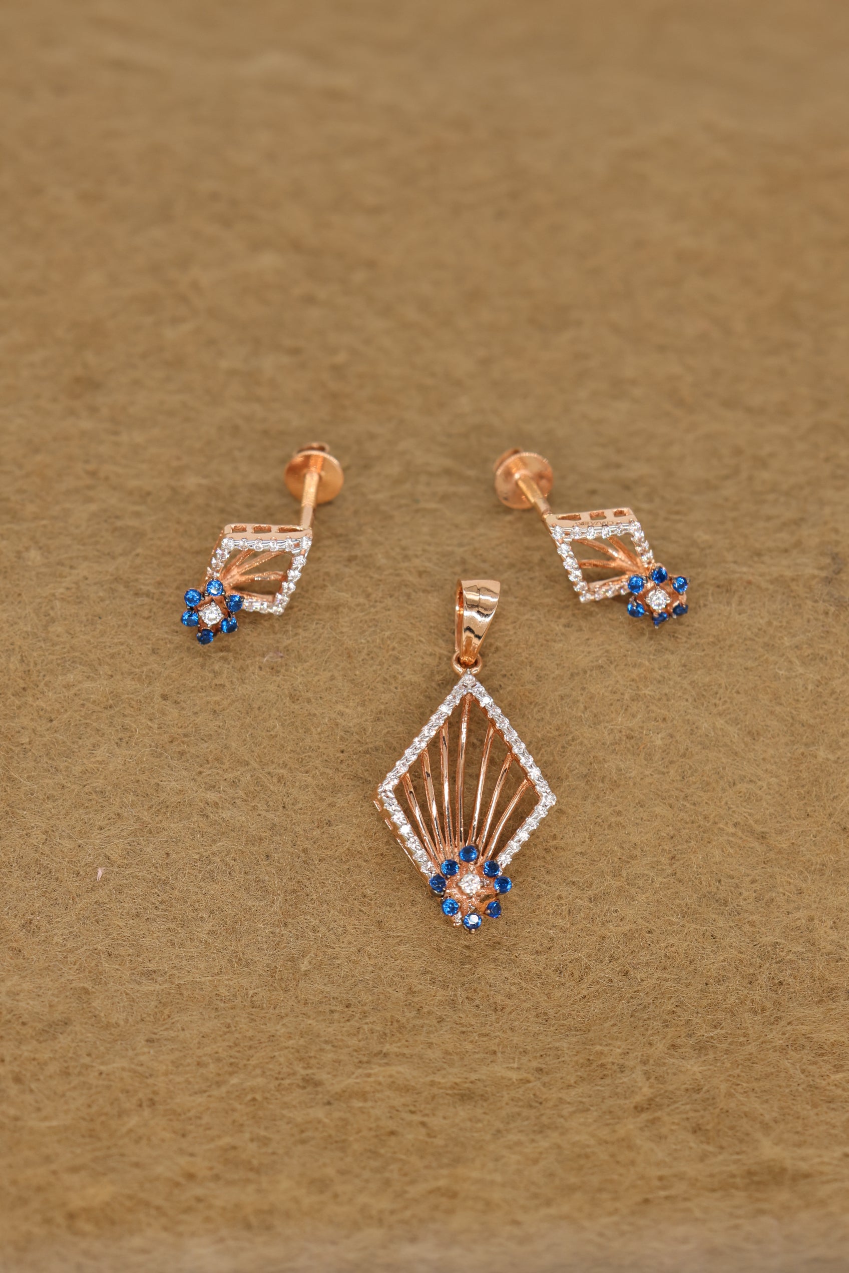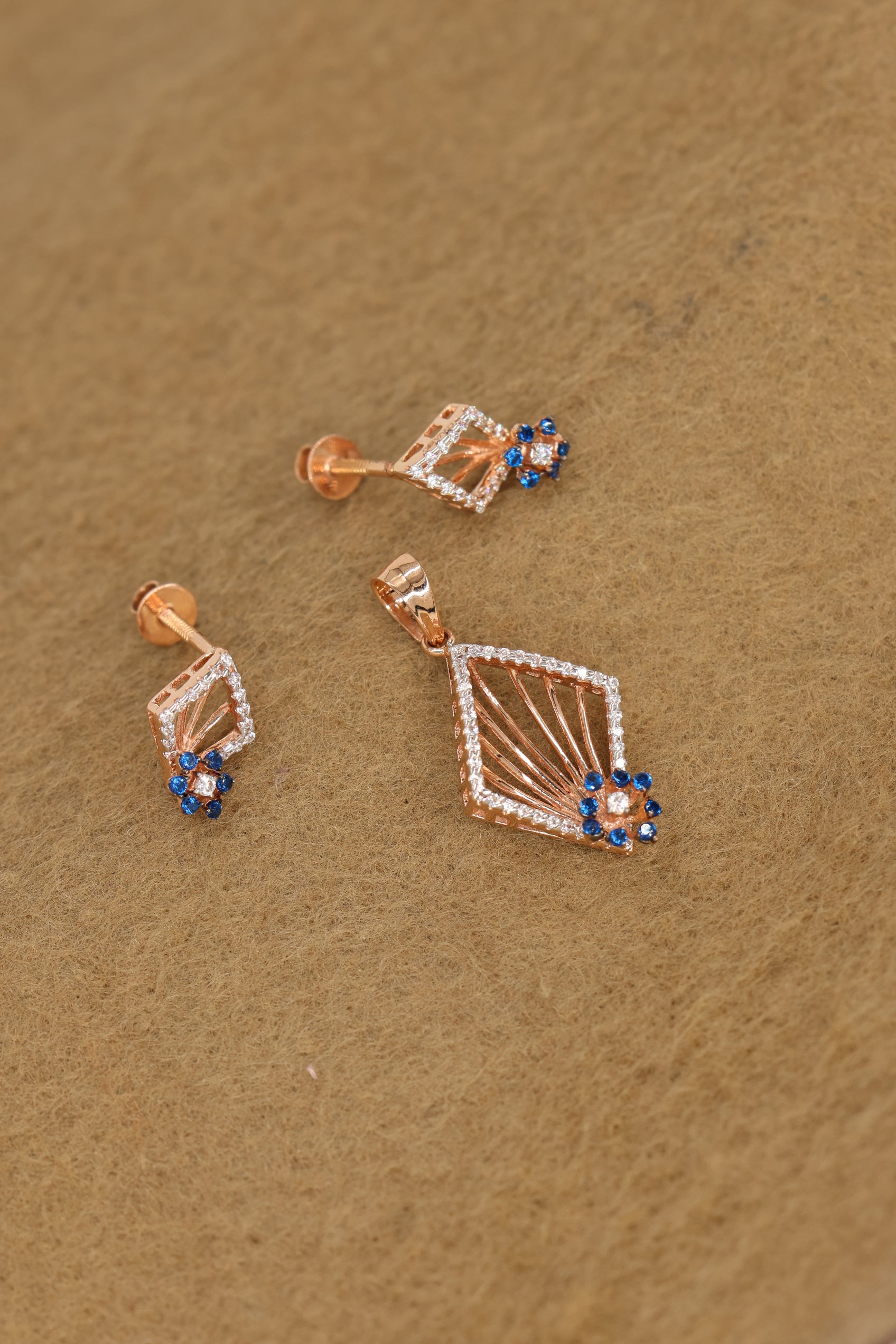Make a bold statement with this exquisite rose gold pendant and earring set featuring a striking Art Deco geometric design. Crafted in luxurious rose gold, this set combines the brilliance of diamonds with the rich blue hue of sapphires for an elegant and captivating look. The pendant showcases a unique fan-shaped pattern with a diamond-encrusted frame and a floral cluster of blue sapphires, adding an eye-catching contrast. The matching earrings mirror this intricate design, completing the set with coordinated sophistication.