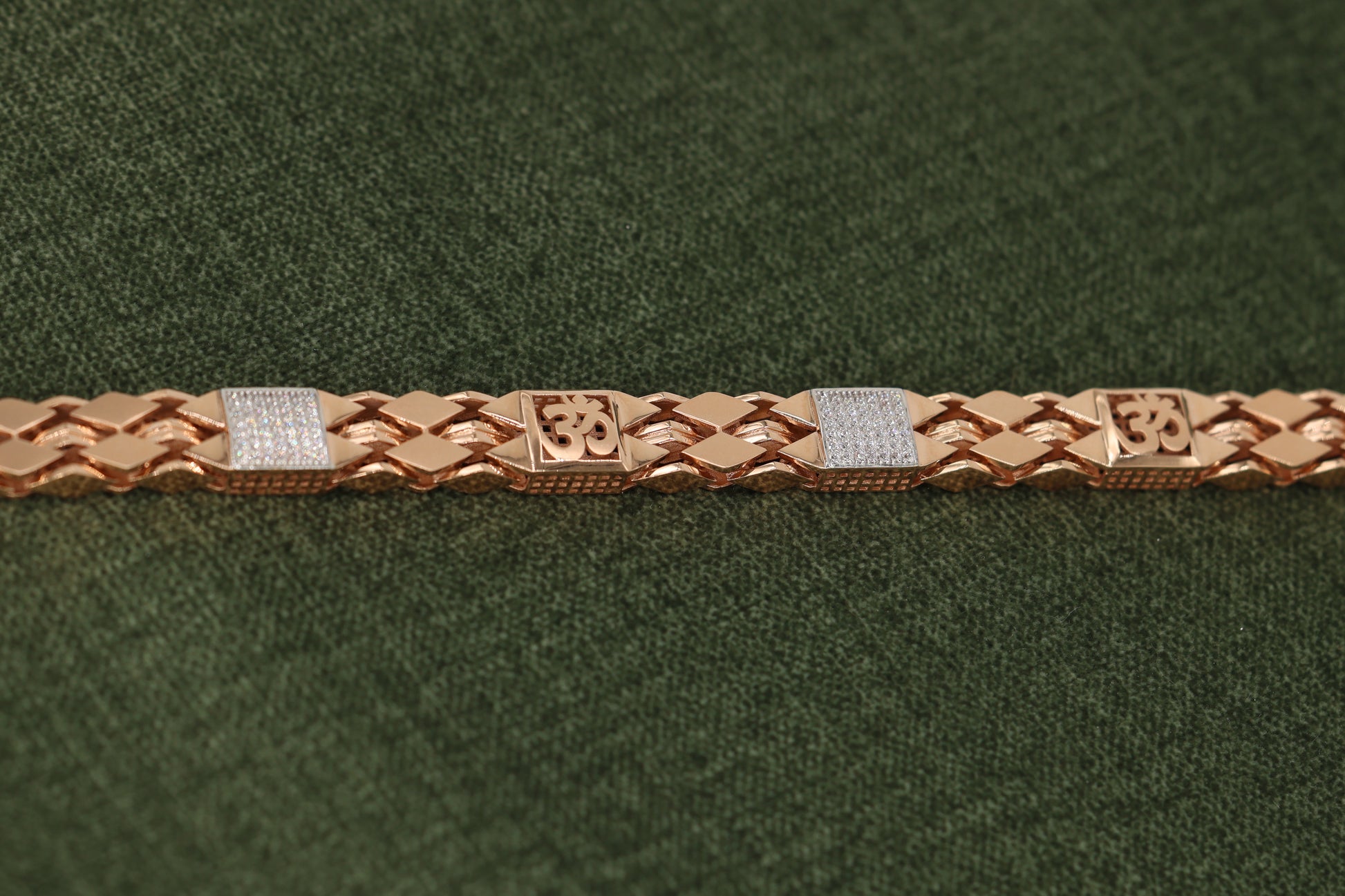 Celebrate spirituality and elegance with this stunning rose gold bracelet, designed to bring peace, positivity, and elegance into your life. This bracelet features the sacred "Om" symbol, intertwined with sparkling diamond-studded sections, making it not only a beautiful piece of jewelry but also a meaningful accessory.