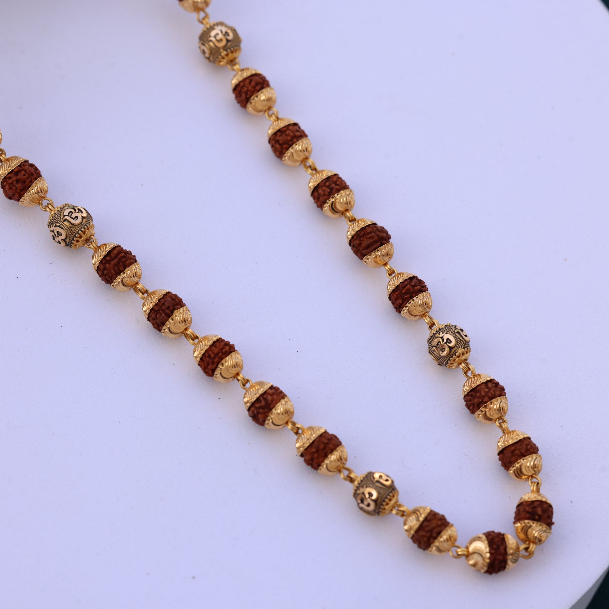 Bring peace, protection, and tradition into your life with this handcrafted Rudraksha bead chain. Each sacred Rudraksha bead is encased in delicate gold-toned caps and linked with fine craftsmanship, offering a beautiful spiritual accessory with timeless appeal. MLA-1284