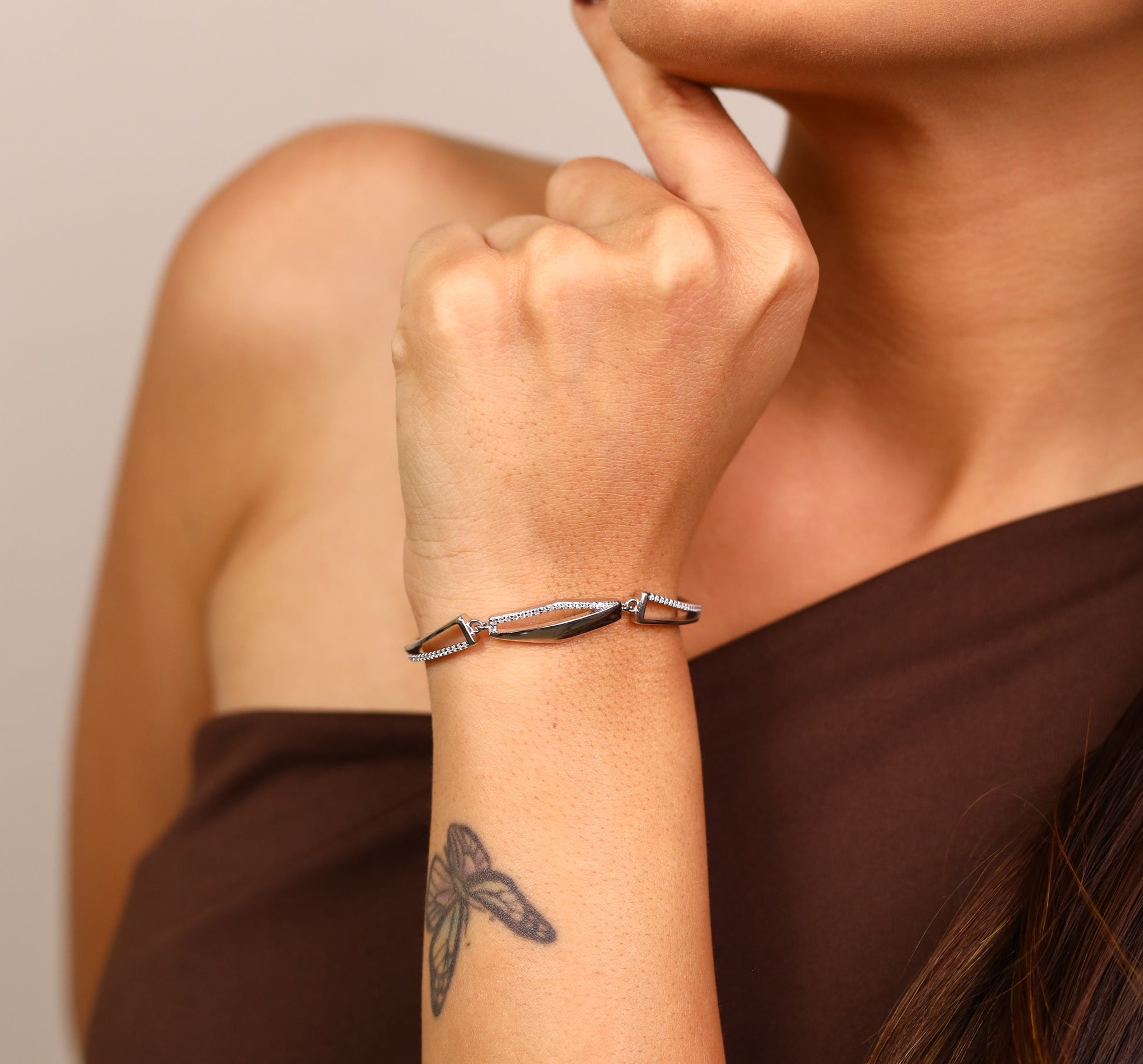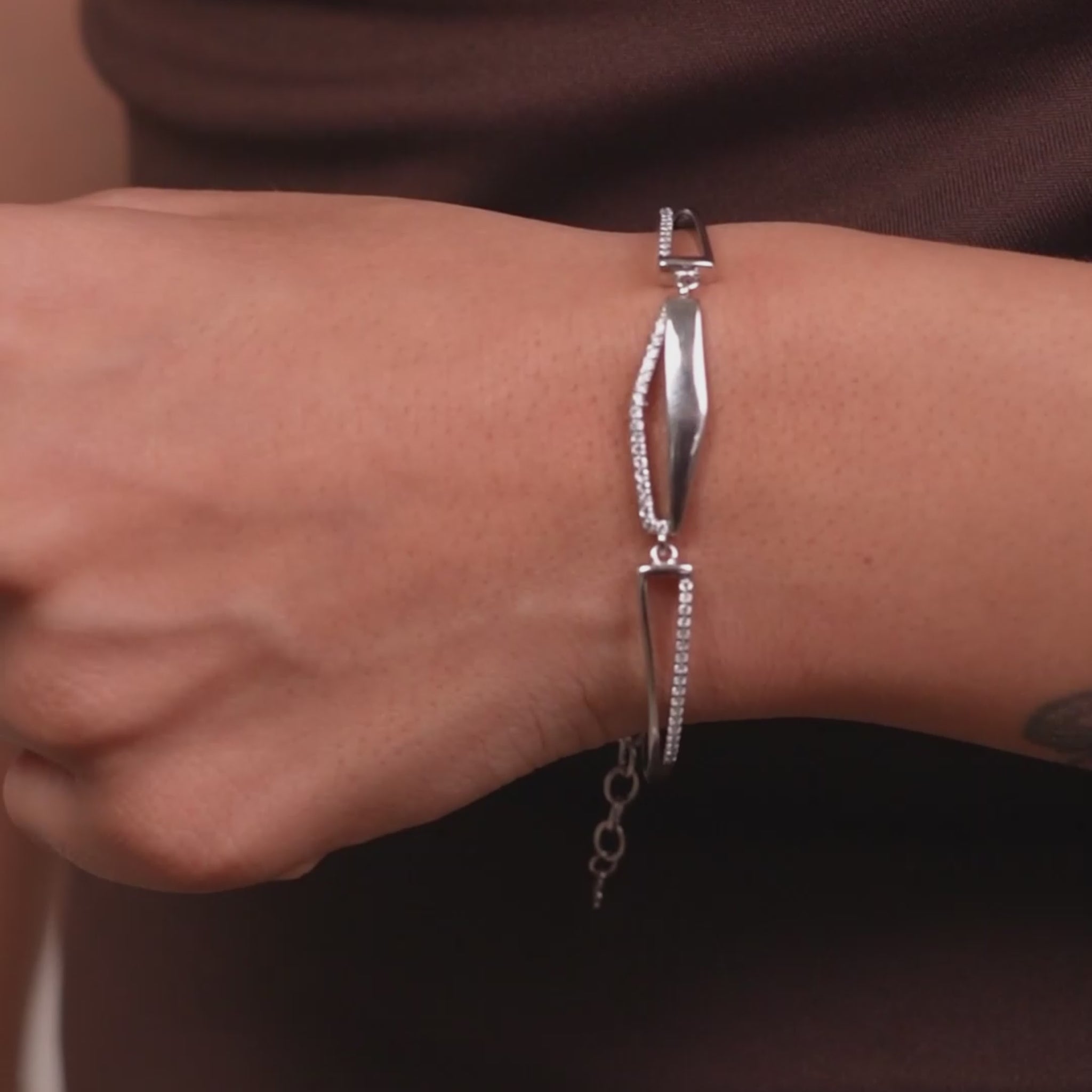 This modern open-style bangle bracelet features a sleek geometric design with sparkling Moissanite stones delicately set along both sides and center accent. The adjustable chain ensures a comfortable and secure fit for all wrist sizes.