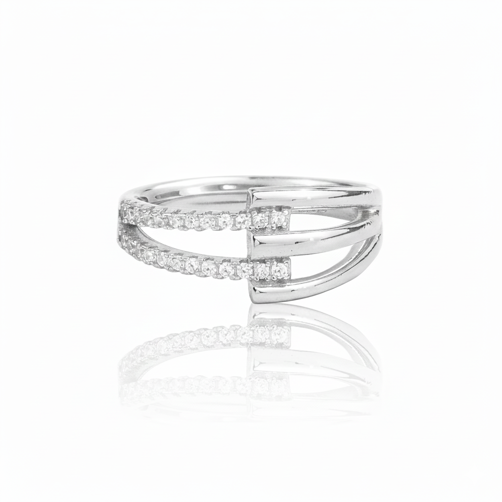 The ring features brilliant-cut Moissanite diamonds, delicately pavé-set along a modern open split band design, creating exceptional sparkle from every angle.